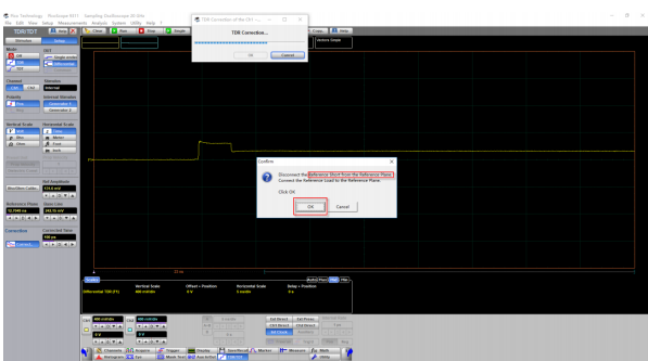 Step 11: 校准-从测试参考平面上断开 Reference Short; 请在连接上 Reference Load 之前不要点击 OK